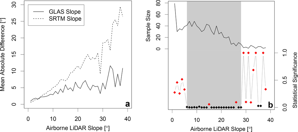 The statistical significance of the difference between ISM and SRTM slope estimates (at 1° intervals) was quantified with a non-parametric Mann–Whitney–Wilcoxon test []. Statistically significant differences are highlighted in Figure 7b as black points within the grey region, illustrated with respect to sample population. In particular, SRTM slopes are not statistically different from ALS equivalents up to 5° (Figure 7a), as well as for larger slopes (>28°); in the latter case, likely due to the small sample population (see Figure 7b). From 5°–28°, the majority of results exhibit statistically significant differences, as supported by Figure 7b. For slopes up to ∼28°, ISM slopes compare well with ALS equivalents; for slopes larger than 5°, they compare better than SRTM estimates. However, beyond 28°, further data would be required to yield a valid test agreement, as the sample is small and the population poorly represented.