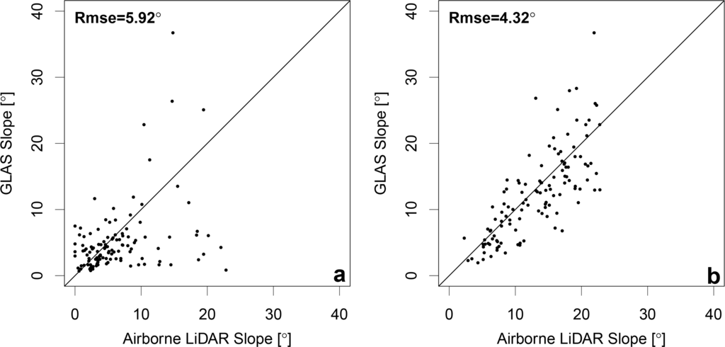 Based on ALS and ISM comparisons, the ISM product is capable of reducing slope uncertainties within GLAS footprints based on a simplistic, robust methodology. The results presented in this study are subject to large within-footprint terrain variability, which scales as a function of increasing footprint mean diameter. Hence, for waveform LiDAR systems yielding smaller footprints than those used in this study, it is not unreasonable to expect improved results with reduced uncertainty. This has been noted in SRTM data also [,]. ISM results are limited according to the quality of the returned waveform profile, which can be disturbed by high density and/or multi-layered vegetation canopies []. Such an effect has been noted to some extent in this study, particularly at the German site of Tharandt. Increased variability noted at this site (RMSE = 5.92°; Figure 9a) is a legacy of vegetation structure, not terrain complexity. This conclusion can be drawn as sites with low canopy density and high terrain complexity, for example Tumbarumba (Figure 9b), produced more coherent results (RMSE = 4.32°) within the same slope range (0° ≤ θ ≤ 25°). Here, in order to ensure that a like-for-like comparison was performed between sites without any sample bias, the same number of (filtered) data present at Tharandt were randomly sampled within the same ALS slope range from Tumbarumba.