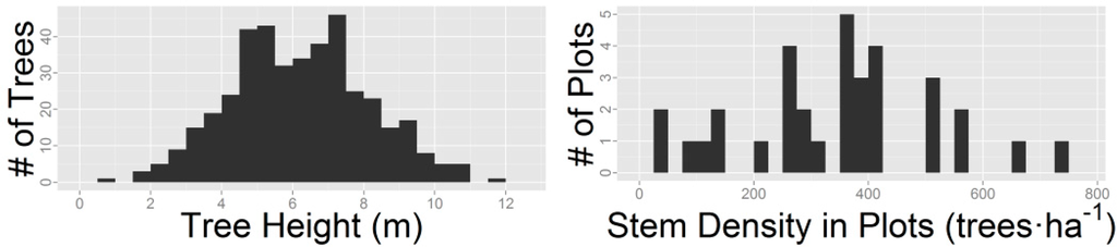 The histogram in Figure 2 shows stem density for trees in the 33 forested field plots that remained available for analysis after data filtering. It explains the range of trees (>3 cm DBH) per hectare for these forested plots centered on GLAS footprints that remained after HRSIWV1 DSM convergence angle and GLAS wflen thresholds were applied. At these 33 plots, 410 trees (Larix sp.) were surveyed for DBH and height. The heights of 400 trees were measured with clinometers and those of the remaining 10 directly with standard tape measurements.