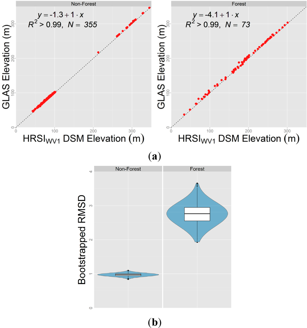 A two-step process was used to examine the uncertainty of forest canopy height estimates using a combination of GLAS ground elevation and HRSIW1 DSM-derived surface elevation. First, we examined the correlation and uncertainty (the bootstrapped root mean square difference; RMSD) between flat ground surface elevation measurements from coincident locations measured by both GLAS and HRSIWV1 DSMs at unforested (i.e., tundra) and forested sites in northern Siberia. This was done to quantify the relative difference between ground surface elevation measurements from each sensor for land covers in which (1) the ground surface elevation measurements are not obscured by trees (Non-Forest); and (2) the ground surface is partially obscured by trees (Forest). The Non-Forest sites were 10 m radius circles centered on GLAS footprints that were classified as free of tree or high shrub vegetation. This classification was done in a geographic information system by overlaying GLAS footprints on HRSIW1, manually interpreting the HRSIWV1 for shrub and tree cover, and then manually selecting only those GLAS footprints that were free of such vegetation. The Forest sites were 10 m radius circles centered on those GLAS footprints for which in-situ field data was collected in forest plots. The ground surface elevation from HRSIW1 DSMs was calculated as the minimum value of all DSM pixels within a plot (dsmmin).
