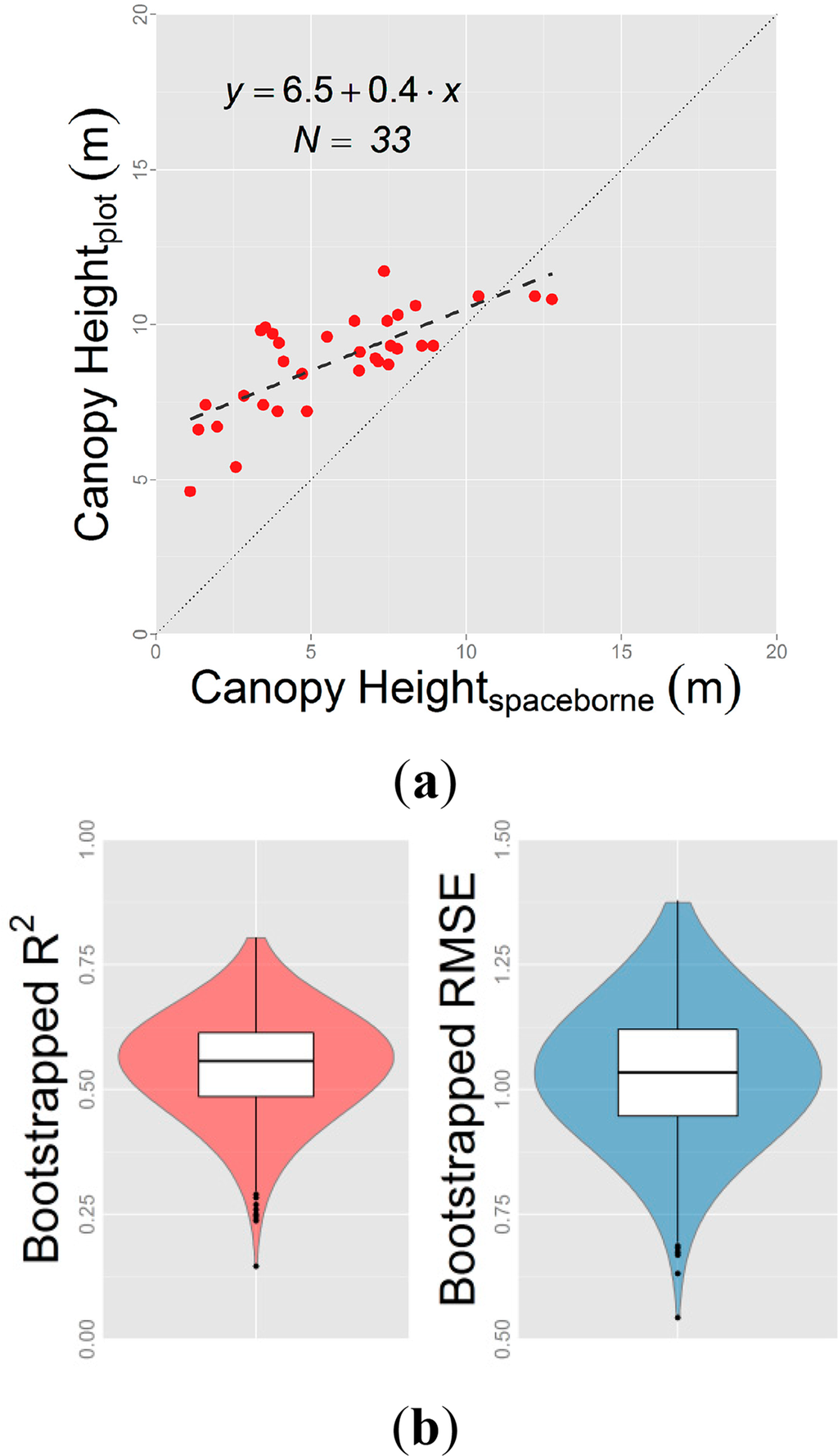 Linear regression was used to model the relationship of the field plot and spaceborne maximum canopy height measurements. With this model, field-derived canopy height was the dependent variable to conform to the approach of using spaceborne measurements to predict those that are ground-based. The fit and uncertainty of this model was quantified using model bootstrapping. This produced a distribution for the model’s R2 and root moon square error (RMSE) by repeated sampling (with replacement) of the data.
