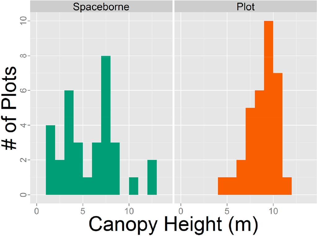 The linear model for predicting plot maximum canopy height is reported in Figure 4a (model coefficients’ p < 0.001). Figure 4b depicts the bootstrapped R2 and RMSE distributions of the model in 4a. This model corrects for the spaceborne measurements underestimating heights less than 10 m, particularly heights <5 m. The bootstrapped RMSE ranged from 0.86 m to 1.37 m at the 95% confidence level. This error was based on a mean bootstrapped R2 of 0.55, which ranged from 0.36 to 0.74 at the 95% confidence level. The histograms in Figure 5 show the distributions of maximum heights from both the field and the spaceborne measurements. Maximum plot heights measured in the field range from ∼5 m to ∼12 m. Those derived from spaceborne measurements ranged from ∼1 m to ∼12 m.