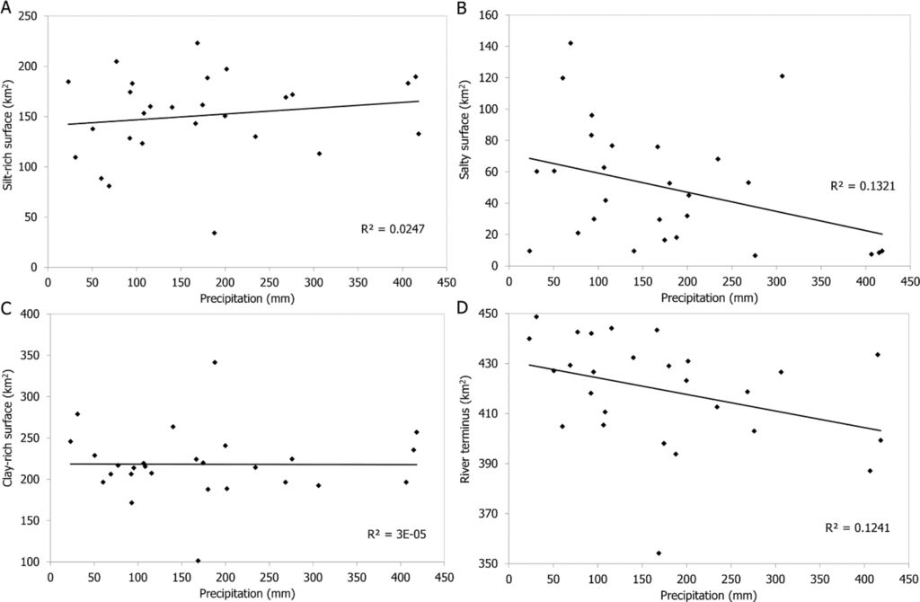 By contrast, the salty surface was negatively correlated with the annual precipitation (Figure 10B), i.e., when the annual precipitation increased, the salty surface decreased. For the clay-rich surface, there is no correlation with the annual precipitation (Figure 10C). The area of river terminus, which includes salty surface, silt- and clay-prone surface, tended to be inversely proportional to the annual rainfall (Figure 10D). This is likely due to the fact that the higher the annual rainfall, the more water is draining to the lake, which results in high water levels in the lake. When the water evaporates, salt is precipitated on the surface. Therefore, the salt area will increase and the river terminus shrinks when the annual precipitation increases.