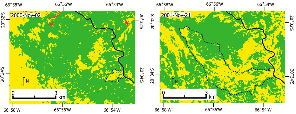 In combination with the annual precipitation, we analysed the areal changes of each class between 1985 and 2011. The silt-rich surface shows a weak correlation with the annual precipitation (Figure 10A) probably because although the annual precipitation is high, the daily precipitation all year around is low. However, some daily precipitation is high in those low annual precipitation periods and Li et al. [21] have demonstrated that high daily precipitation would lead to peak discharges, which result in large flow and sediments transport to the river terminus. During these short-lived and high magnitude of peak floods or multiple successive floods, channels experience massive over-spilling flow due to the downstream decrease in cross-section area on the low-gradient Río Colorado river system [21,43] and the spill-over flow reactivates crevasse splays and levees. For instance, the crevasse splay was partly reactivated in the rainy season of 1999–2000. However, it was completely reactivated in the rainy season of 2000–2001 because of the highest annual precipitation (406.4 mm) in the period from 1985 to 2011 (Figure 11).