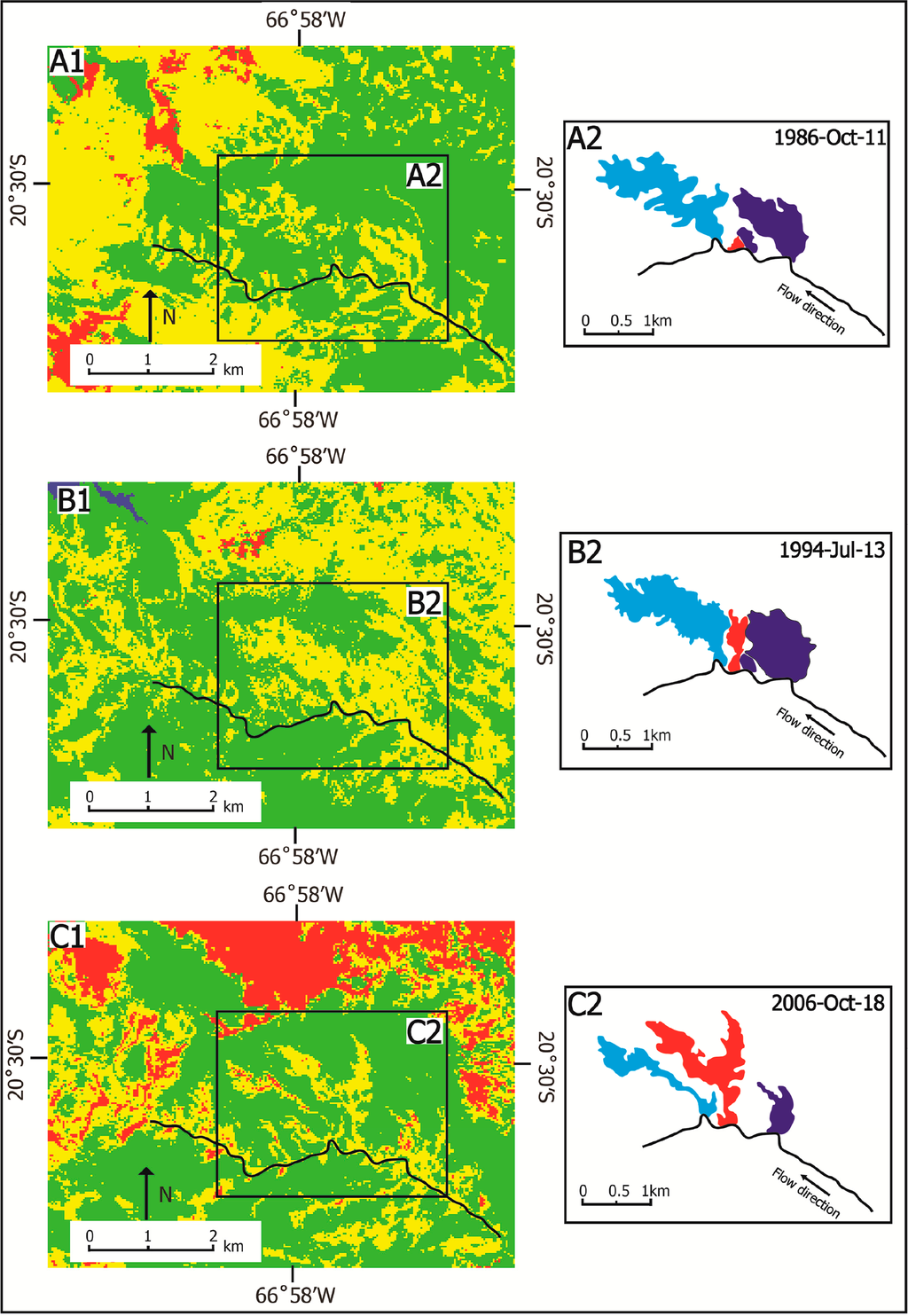 Playas in endorheic basins are of environmental value and highly scientific because of their natural habitats of a wide variety of species and indicators for climatic changes and tectonic activities within continents. Remote sensing, due to its capability of acquiring repetitive data with synoptic coverage, provides a unique tool to monitor and collect spatial information about playas. Most studies have concentrated on evaporite mineral distribution using remote sensing techniques but research about grain size distribution and geomorphologic changes in playas has been rarely reported. We analysed playa morphodynamics using Landsat time series data in a semi-arid endorheic basin, Salar de Uyuni in Bolivia. The spectral libraries explaining the relationship between surface reflectance and surficial materials are extracted from the Landsat image on 11 November 2012, the collected samples in the area and the precipitation data. Such spectral libraries are then applied to the classification of the other Landsat images from 1985–2011 using maximum likelihood classifier. Four types of surficial materials on the playa are identified: salty surface, silt-rich surface, clay-rich surface and pure salt. The silt-rich surface is related to crevasse splays and river banks while the clay-rich surface is associated with floodplain and channel depressions. The classification results show that the silt-rich surface tends to have a positive relationship with annual precipitation, whereas the salty surface negatively correlates with annual precipitation and there is no correlation between clay-rich surface and annual precipitation. Salty surfaces seem to consist primarily of clay due to their similar characteristics in response to precipitation changes. The classification results also show the development of a crevasse splay and avulsions. The results demonstrate the potential of Landsat imagery to determine the grain size and sedimentary facies distribution on playas in endorheic basins.1. Introduction