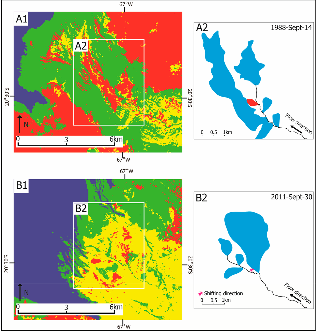 We also suggest that post-processing such as majority/minority analysis, sieve classes should not be performed on classification maps. First of all, the inter-channel deposits are generally clay-rich and, therefore, their reflectance is low. In addition, the inter-channel area is sometimes small (e.g., crevasse channels) with the ground resolution of the Landsat TM images being 30 m by 30 m. Using these post-processing methods tends to blur these sedimentary phenomena and create errors. Therefore, the statistical analysis on playa morphodynamics was found the result of maximum likelihood classification to be better than that with post-processing.