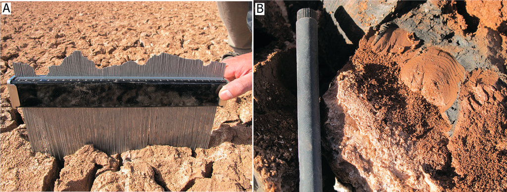 Due to salinity, the Time Domain Reflectometry (TDR), which is used to simultaneously obtain soil water content and electrical conductivity by a single probe with a minimal disturbance [44], did not work properly. However, field observation showed that the clay-rich surface is wetter than the silt-rich surface (Figure 14A). In addition, the density of desiccation cracks (Figure 14B) is also higher on the clay-rich surface than on the silt-rich surface. Both soil moisture and desiccation cracks exert a reduction on reflectance.