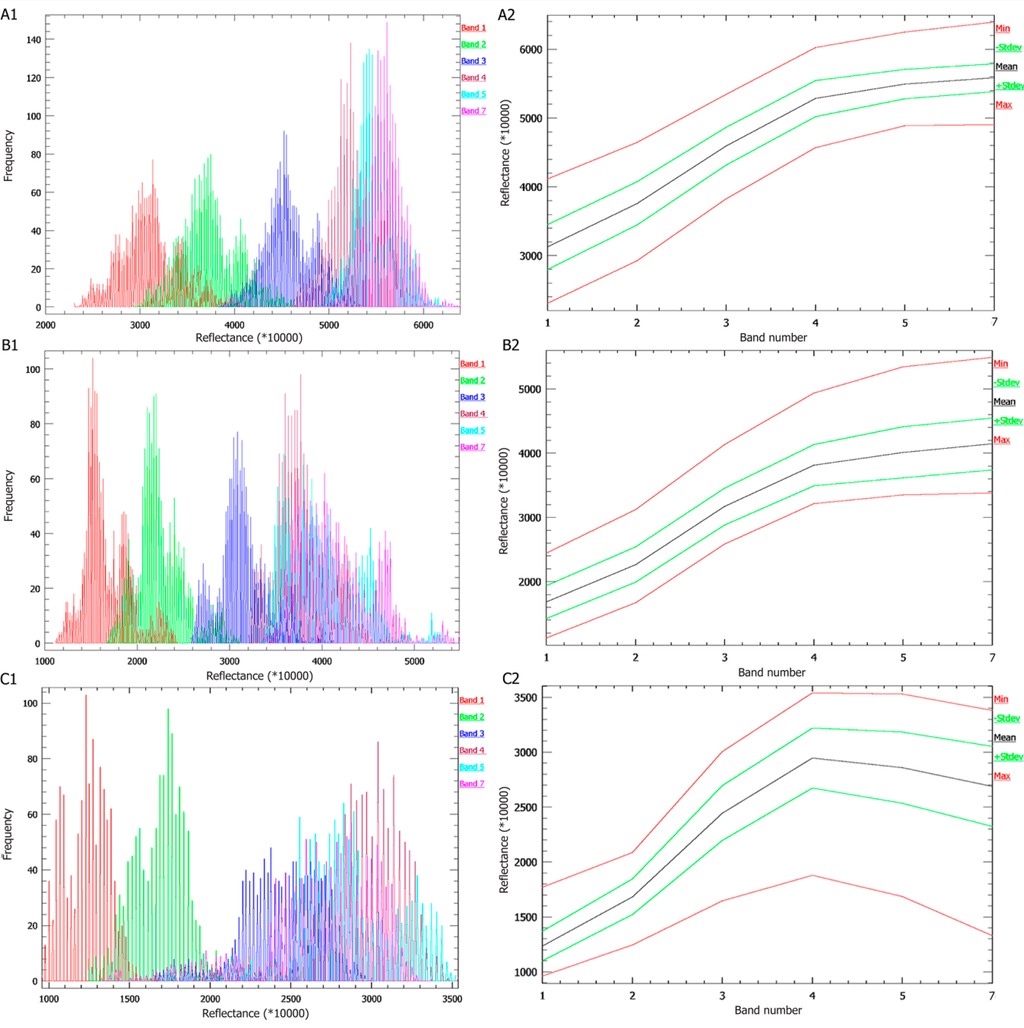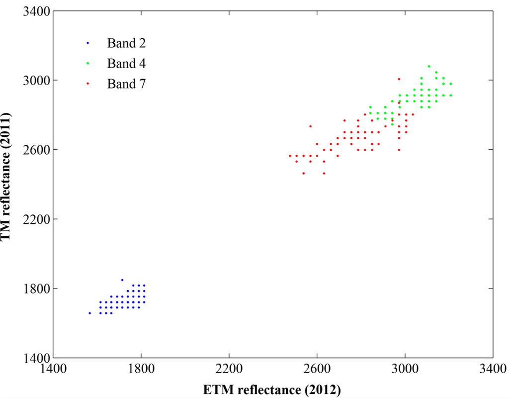 Spectral libraries of different classes (end-members) were built using the Landsat image on 11 November 2012 and ground truth data collected during the field campaign (Figure 3). This image was selected as the base image since this is the closest date corresponding to the ground measurements and there was no TM image available for this year. Bands with a low fraction of saturated pixels have been selected for later normalisation and classification. In this paper, we used three Landsat bands 2, 4 and 7, which have low fractions of saturated pixels for the period 1985–2011 according to digital number statistics of all bands. All these selected bands were subsequently normalized to a referenced image with IR-MAD transformation [38]. The IR-MAD requires a full dataset since it uses the spatial data over the entire scene for the normalization. Therefore, the ETM image of 2012 due to the missing lines (Scan Line Corrector (SLC) failure) cannot be used and we have taken the TM image of 2011 as the reference image for normalization of the other images. This might introduce error into the analysis, however, since the data are surface reflectance (Landsat CDR data) that is supposed to be corrected for illumination, sensor-related and other effects, this error will not be significant over such a homogeneous area. Moreover, the high coefficients of determination (mean R2 > 0.95) indicated strong correlations between the reference image and targeted images.