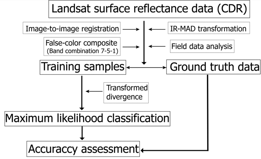 As seen in Figure 3, first of all, image-to-image registration is done to make sure that a certain pixel covers the same area in all the images. The Landsat surface reflectance data are then normalized with Iteratively Reweighted Multivariate Alteration Detection (IR-MAD) transformation to eliminate the unwanted effects due to illumination variation for different dates, although, surface reflectance data as used in this study (Landsat CDR) are supposed to be corrected for such effects which implies that such normalizations may not be strictly required [34]. The false-color composite of the base image in combination with field data analysis were used to select training samples. Prior to classification, it is necessary to check the separability of the target classes. This has been done using the transformed divergence technique, where a low value between two classes indicates similarities between them and hence difficulties in distinguishing two distinct classes by the classifier. The maximum likelihood classifier was then applied for the classification. This is a well-known approach that has been frequently used for classification in semi-arid environments [35–37]. The accuracy assessment of the approach was evaluated by different metrics including overall accuracy, kappa coefficient, producer’s accuracy and user’s accuracy. More detailed explanation of the methodology will be given in the following subsections.