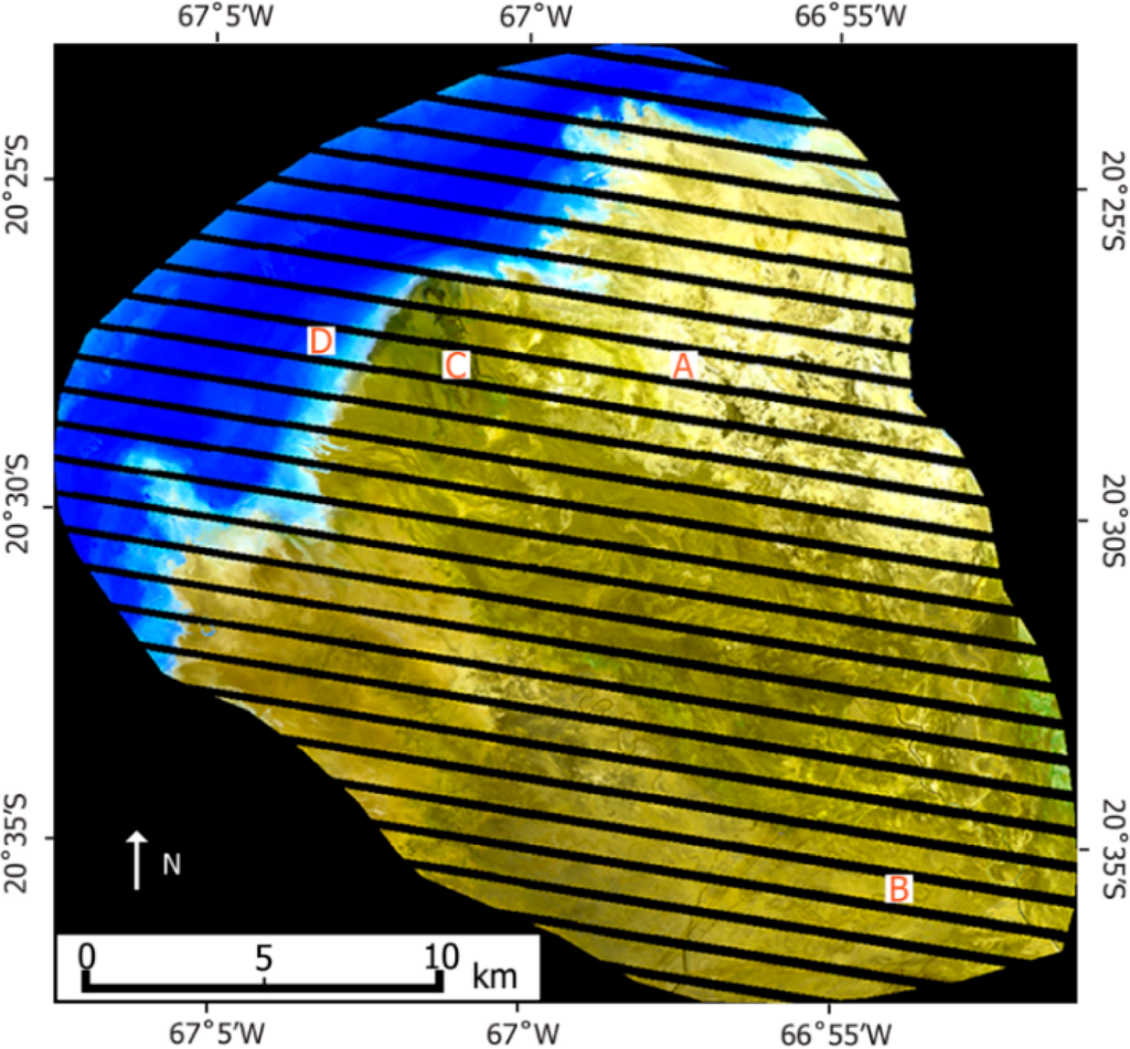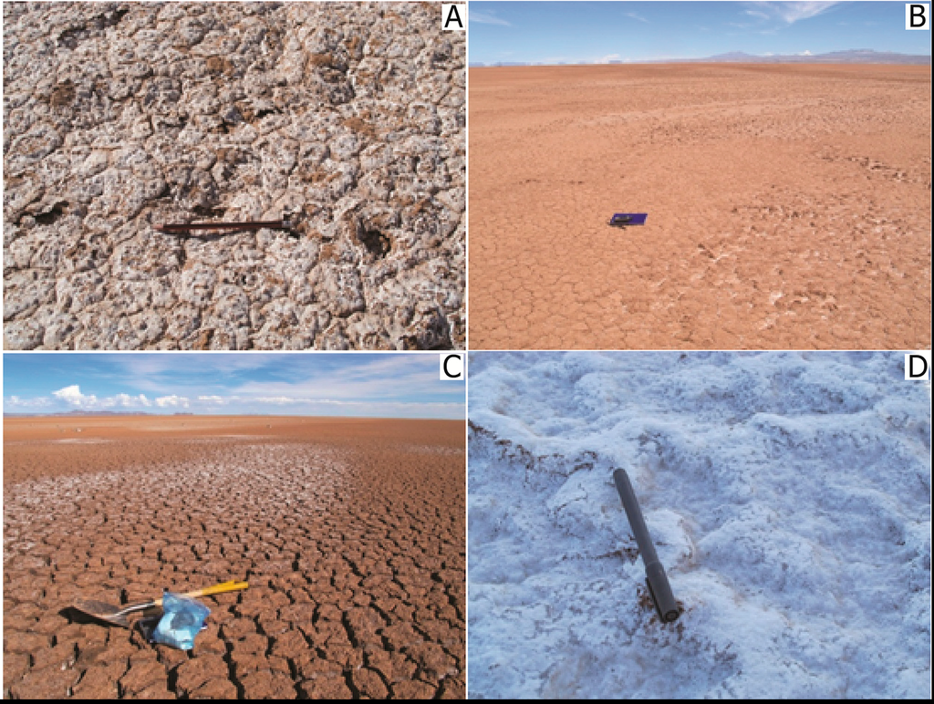 The Altiplano Basin has a semi-arid climate with an annual precipitation of more than 800 mm in the north and less than 200 mm in the south [30] and an evapo-transpiration potential of 1500 mm [31,32]. Precipitation shows this clear-cut north-to-south decrease in Altiplano plateau due to the low pressure systems of the Altiplano, strong low-level north-westerly winds with warm, moist, unstable air flow along the eastern flank of the central Andes giving rise to convection precipitation. Moreover, pole-ward low-level air flow helps to maintain the intense convection [33]. The rainy season in the study area is from December to March, and the average annual rainfall is about 185 mm, which is greatly exceeded by potential evapo-transpiration. With SE-to-NW flow direction, the Río Colorado is one of the main inflow rivers for the Salar de Uyuni. In this study, we focus on the terminus of Río Colorado river system, where human interference is limited.