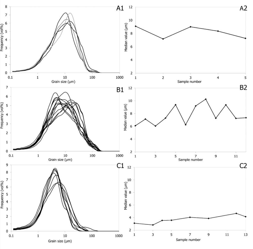 The field campaign included surface color analysis and sampling. Surface color analysis included the four documented types of surface materials based on false-color composite map (Figure 5). The colours of different surface deposits were determined using Munsell colours chart in the field: A is from 2.5 YR 8/2 to 5 YR 8/2 (light pink); B is from 2.5 YR 8/4 to 5 YR 8/4 (pink); C is 7.5 YR 6/3 to 7.5 YR 5/6 (light/strong brown). The samples were then analysed in terms of grain size with a Sympatec HELOS KR laser-diffraction particle sizer with a size range from 0.1–2000 µm. The results of the grain size analysis of field samples were used to validate the analysis of the false-color composite Landsat images on 11 November 2012 (Figure 6).We assigned the following names to the classes: A, salty surface; B, silt-rich surface; C, clay-rich surface; D, salt. Here, salty surface represents mixed sediments of salt and silt or clay with a light pink colour, while the silt-rich surface is coarser than the clay-rich surface. Salt indicated a thick, white salt crust on the surface.