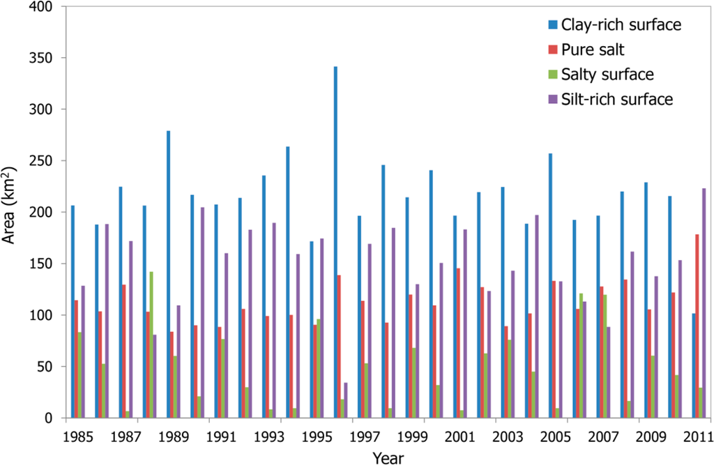 Surface materials change over years in terms of the area that they cover (Figure 8). The clay-rich surface is the most dominated surface material with a few exceptions over the period 1985–2011 (Table 5) covering on average 40% of the study area. According to the standard deviations, the salt remained consistent over time (with standard deviation of 21.48 km2) compared to the other surface materials in the study area. However, in the river terminus, all the three surfaces are characterized with large variations over time with standard deviations of 38.37 km2, 41.96 km2 and 41.27 km2 for salty, silt-rich and clay-rich surfaces, respectively. However, the classification results of the year 1996 showed very large discrepancies compared to the other years for the three surfaces which seemed to be abnormal in this case. We could not identify any specific reason for this discrepancy.