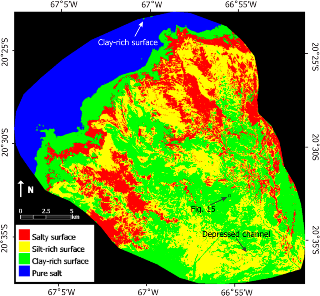 In the river terminus, the silt-rich surface and the clay-rich surface tend to be associated with different sedimentary facies. For example, the silt-rich surface is distributed on crevasse splays and levees along channels, while the clay-rich surface can be found on the floodplain between channels. In addition, the silt-rich surface was generally distributed in the proximal part of the river terminus while the clay-rich surface was commonly seen in the distal part of the terminus. The clay-rich surface sometimes could be seen in the salt lake, probably attributed to peak floods or wind (Figure 9). During peak floods, the water is at its highest level in the salt lake and clay is transported to the salt lake and the edge of the water body. When the water evaporates and salt is precipitated, the clay in the deep water area is covered by salt but clay at the edge of the water body is mixed with salt and exposed. Depressed channels were also covered by the clay-rich surface, although sometimes salt could be found in the present channel (Figure 9). The salty surface was generally distributed in the channels and the distal part of the river terminus, while the salt was generally distributed at the end of the present channel and the salt lake.
