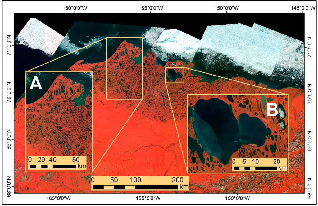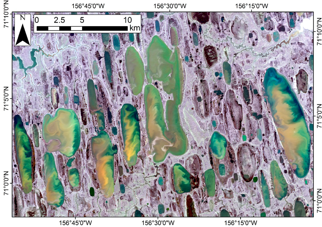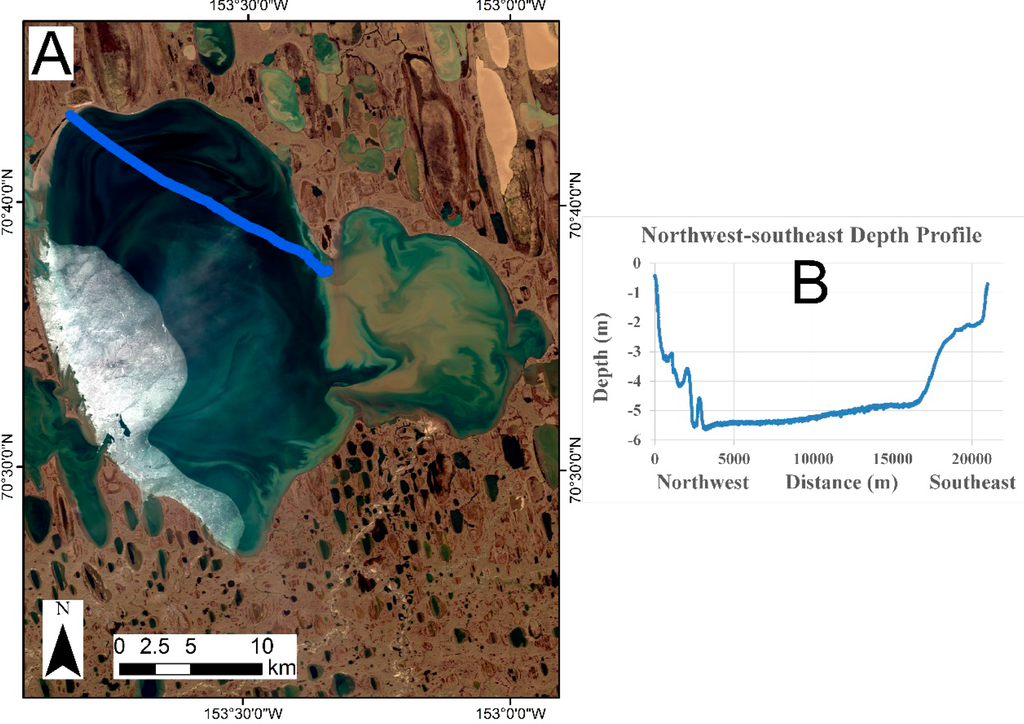 Thermokarst (thaw) lakes were a significant source of carbon during the last deglaciation [1,2] and their release of carbon is influenced by a positive feedback to climate warming [3]. Studies have shown that permafrost carbon stocks are also vulnerable to climate change related thawing [4–6]. The timing of lake ice-out serves as a proxy indicator of regional climate variation. Earlier ice melt and later ice onset have been observed in lakes on the Arctic Coastal Plain (ACP) of northern Alaska [7,8]. Lakes with depths greater than the maximum ice thickness during winter (approximately 2 m) are important sources of liquid water for aquatic biota, inhabitants and the petroleum industry [9]. Lakes along the Arctic coast are also influenced by coastal erosion and storm surge flooding that often result in lake drainage and their conversion to estuaries which affects the aquatic and terrestrial habitat [10].