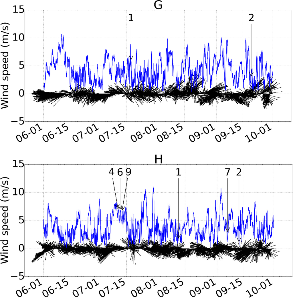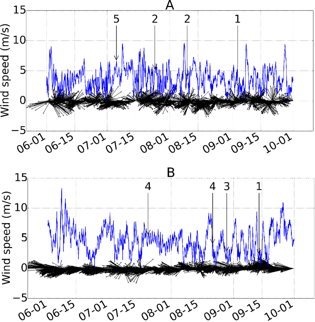 Figure 11 shows the time-series of wind data collected at Barrow from 1 June to 30 September 2013. The blue line shows the hourly series of wind speed and the black arrows represent wind direction and magnitude at each hourly sampling point. Four Landsat 8 scenes fall into this time period and the number of gyres in each scene (4, 10, 72 and 1) are indicated in the plot. It can be seen that wind speed was steadily increasing starting from 6 July to a peak on 15 July. The number of gyres was also increasing from 10 (8 July) and 72 (10 July). Wind direction during this time period shifted from east-southeast to north-east and to east-northeast. Similar behavior has been observed on Lake Onega in Russia with a double-gyre circulation system forming after a few hours of steady moderate wind forcing and persisting for days during calm intervals [26].