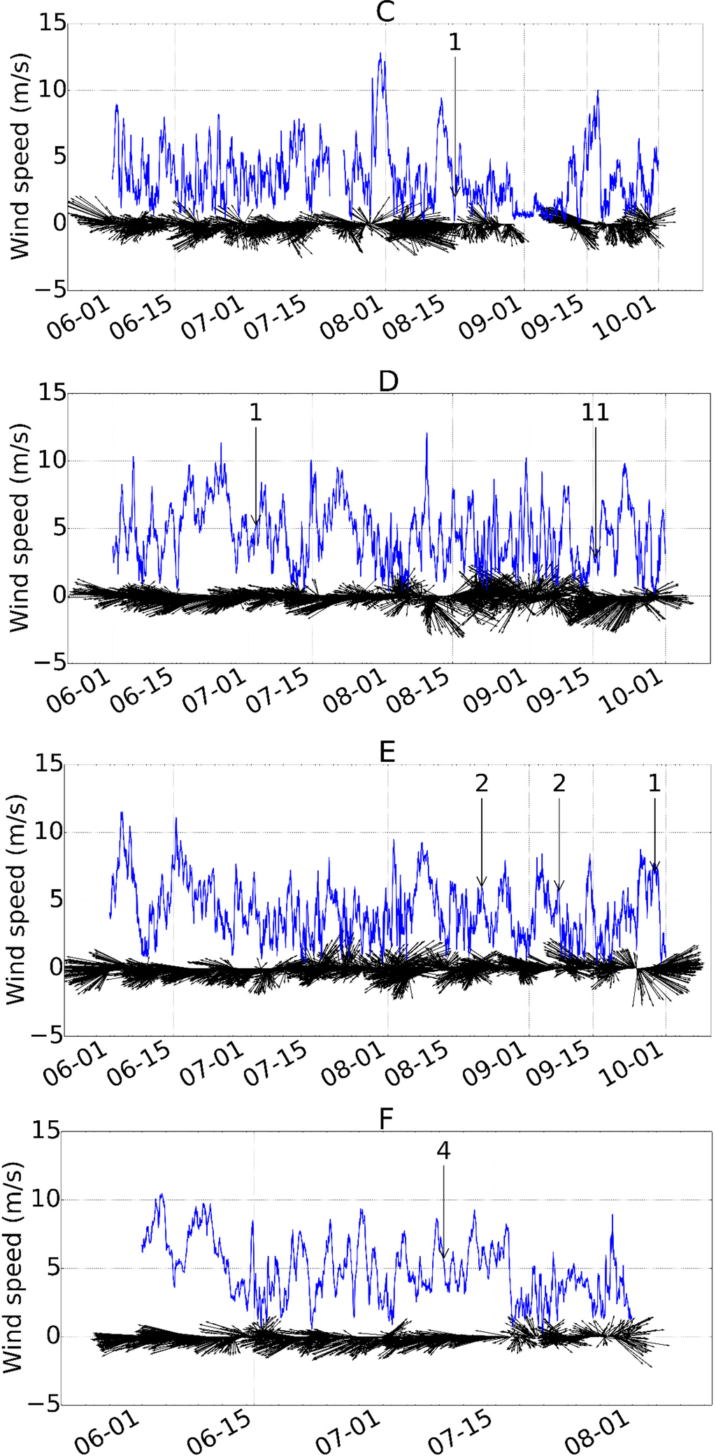 Figure 12 shows the time-series of wind data collected near Teshekpuk Lake from June to September each year from 2006 to 2013. The time-series started on 1 June and ended on 30 September in all years except for 2011 which ended on 31 July. Gyres have been found in 28 usable images from 2006 to 2011. On average, 3.5 images each year can be found that have gyres in Teshekpuk Lake and each image contains 2.7 gyres.