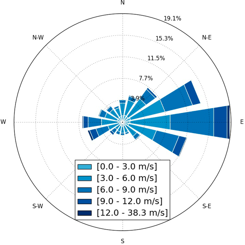 Meteorological datasets were collected from meteorological stations located in Barrow, Alaska and east and north of Teshekpuk Lake. The meteorological station in Barrow was established by the National Oceanic and Atmospheric Administration (NOAA). Data collected from this station covers from 1973 to 2013 and consists of hourly-averaged wind speed and wind direction. This dataset was used for the Barrow study area. The stations at the east and north of Teshekpuk Lake were established by USGS (data courtesy of the Teshekpuk Lake Observatory). Data collected from east of Teshekpuk Lake covers from 2004 to 2013 [36] and data collected from north of Teshekpuk Lake covers from 2012 to 2013. Both datasets consist of hourly-averaged wind speed and wind direction. These two datasets were used for the Teshekpuk Lake study area.