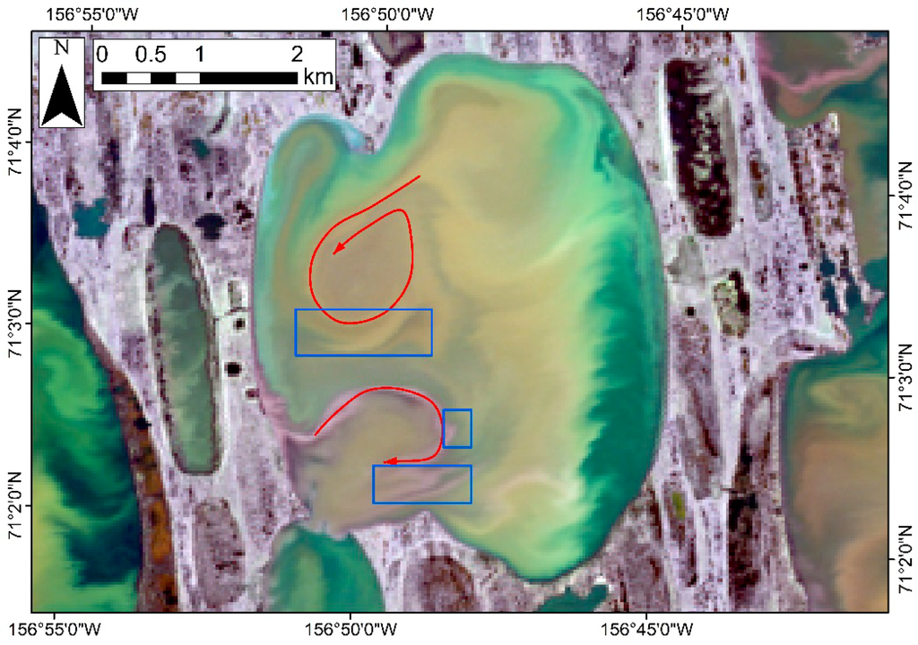 All three lakes are located near Barrow, Alaska. Under similar wind conditions, the observed current flows in Ikroavik Lake and Gull Lake (Figures 13 and 14) are reasonably comparable to the theoretical model, though the observed currents are naturally more complicated. The wind direction at Loon Lake (Figure 15) during the WorldView overpass was slightly different from that when Carson and Hussey [12] conducted their measurements (east-southeast vs. east), but nonetheless resulted in a CW gyre near south shore and an ACW gyre near north shore. The different spatial location of CW and ACW gyres indicates that there are preferential locations where gyres tend to form (i.e., near north and south shores) under the prevailing wind regime. These near-shore current activities may promote erosion of north and south shores over time, which may ultimately lead to thermokarst lake elongation and orientation that is observed today. The ability of gyres to resuspend and redistribute sediment may also help to explain the flat bottom found in many of the lakes on the ACP [33].