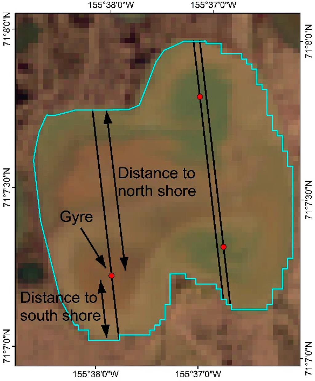 The locational differences of the 72 gyres in the lakes in the Barrow study area and a total of 111 gyres found from images spanning from 1999 to 2013 in Teshekpuk Lake study area were examined. Table 5 shows the statistics of the locational differences of CW and ACW gyres within lakes in Barrow study area, while Table 6 shows the statistics of the locational differences of CW and ACW gyres within Teshekpuk Lake study area. The distance values were standardized by the length of the long axis across each gyre. The distance value starts at 0 on the south shore and reaches 1 on the north shore.