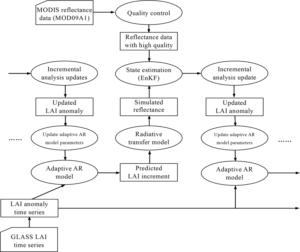 At each site, the LAI climatology was calculated from 2000 to 2010 using GLASS LAI data. The LAI anomaly time series were calculated by subtracting the LAI climatology from the GLASS LAI value. Based on the time series of LAI anomaly as the input data, an adaptive AR model was constructed to predict the LAI anomaly for the next time step. In addition, the predictions from the dynamic models and the MODIS reflectance data were combined to update the LAI using the EnKF coupled with the ACRM. Then, the discontinuities between the analysis from the EnKF and the prediction from the dynamic model were removed using the IAU technique.