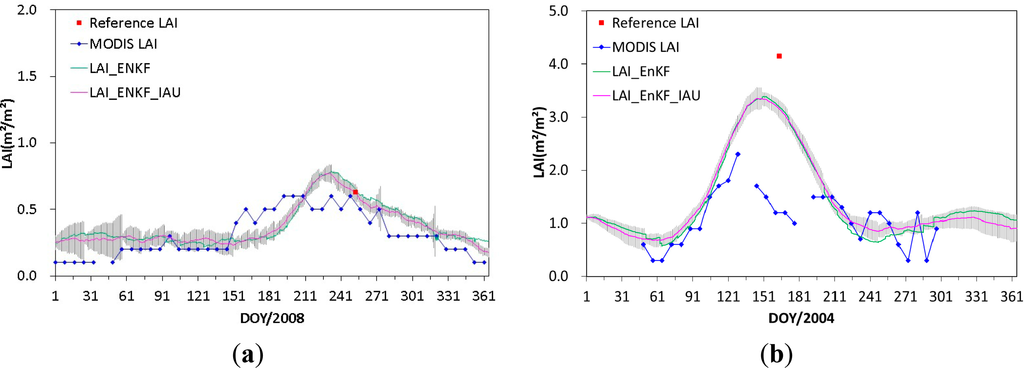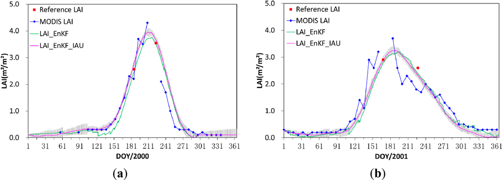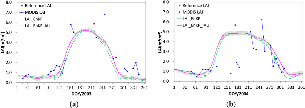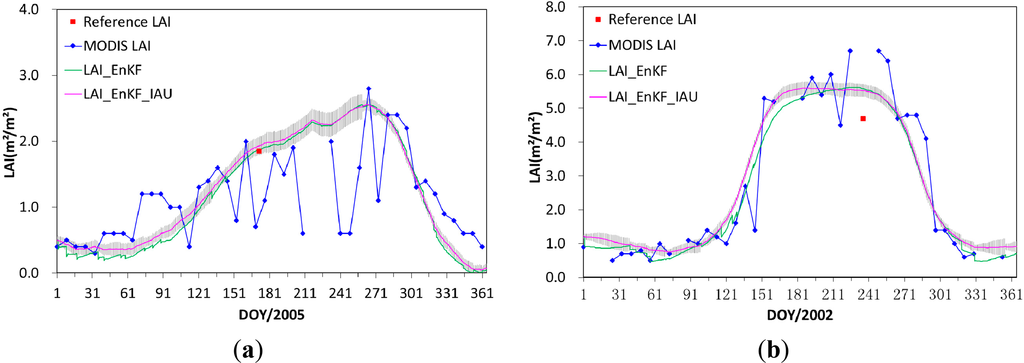 At the Donga site (Figure 4a), the LAI anomaly was calculated from 2003 to 2004. During the whole growing season, the MODIS LAI was erratic and displayed some low values, which were not realistic for this site. Excluding those observation data that exhibit poor quality, the LAI values retrieved from EnKF without IAU still exhibited large-amplitude discontinuities reproduced from the fluctuating values of the observed data, but exhibited relatively reasonable changing tendencies, especially during the peak growing season compared with the MODIS LAI. However, the IAU method damped the spurious discontinuities, included in the LAI values without IAU and presented a continuous result. The reference LAI was on Day 172. Although the MODIS LAI indicated an abrupt dip in value on that day and the difference with the reference LAI was 1.15, the IAU result still remained close to the reference, with the difference being 0.08.