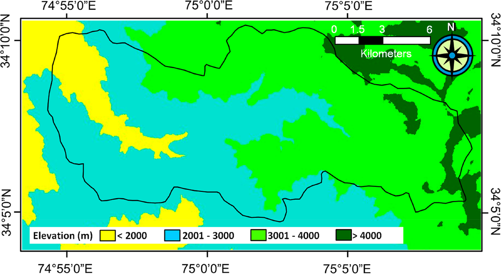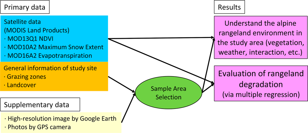 The ultimate goals of this research are to evaluate the condition and degradation status of the alpine rangeland in Dachigam National Park, Northern India, through the 10 years from 2001 to 2010 using MODerate resolution Imaging Spectroradiometer (MODIS) NDVI as a surrogate for vegetation amount and to evaluate the applicability of a satellite-based approach for the areas where ground-based weather information is difficult to obtain. MODIS is a sensor onboard NASA’s Terra and Aqua satellites. The sensor views the entire Earth’s surface with high temporal resolution (every one to two days), which is an advantage for application in cloudy regions such as Dachigam. In Dachigam, livestock holders have insisted that the park’s grazing conditions have degraded during the period, however, the details are unknown because no scientific and objective evidence of the degradation is available. This study aims to scientifically and objectively evaluate the rangeland environment by efficiently using MODIS satellite imaging products. The literature indicates that the growth of alpine vegetation and/or grassland biomass production is largely impacted by climate elements such as precipitation [15,16], solar radiation [17], and air temperature [16]. In this study, we applied MODIS evapotranspiration products in a unique way to express the spatial distribution of energy and soil water conditions within the study area. Degradation of the alpine rangeland was evaluated via multiple regression using satellite-derived climate and soil-water information, with information of year serving as independent variables and vegetation information as the dependent variable.
