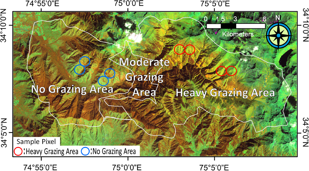 The Dachigam National Park Management Plan [19] contains some map data, such as land-cover classification and grazing intensity of the park. Land-cover and grazing-intensity information were used as basic information for sample area selection in this study.