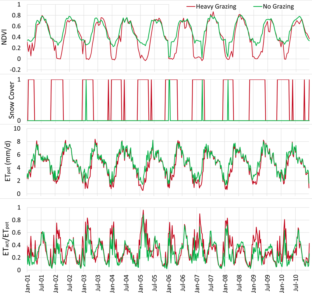 The result of the analysis for general vegetation and climatic conditions of the study area indicated that snow cover delays the growth of grass in heavy-grazing areas, which are located at higher altitudes. At the heavy-grazing areas, snow is generally available until around mid-April, and the late snowmelt most likely appeared as a 0.15 reduction of NDVI in May. Additionally, a strong short-term relation was found between vegetation amount and soil moisture. NDVI and ETact/ETpot for the 16-day period during May to October (10-year average) showed a strong linear relationship in both the heavy-grazing and no-grazing areas (R2 of 0.75 and 0.86, respectively). Summer rainfall in the park might have supported growth of pasture in both the heavy-grazing and no-grazing areas. An annual multiple regression analysis indicated that the relative amount of grass in the heavy-grazing area, if compared to the no-grazing area, was affected primarily by soil water content, which appeared not as ETact/ETpot but as ETpot, and the temporal extent of snow cover. The statistical analysis also indicated the possibility of degradation of the heavy-grazing rangeland at a decadal timescale. Some uncertainties exist in the input data and the results, as discussed in Section 3.3. However, the multiple-regression result obtained in this research at least indicated the possibility that land degradation in heavy-grazing area had progressed during the evaluated 10-year period. The indication agreed with the observations of livestock holders and the report of the park’s management plan.