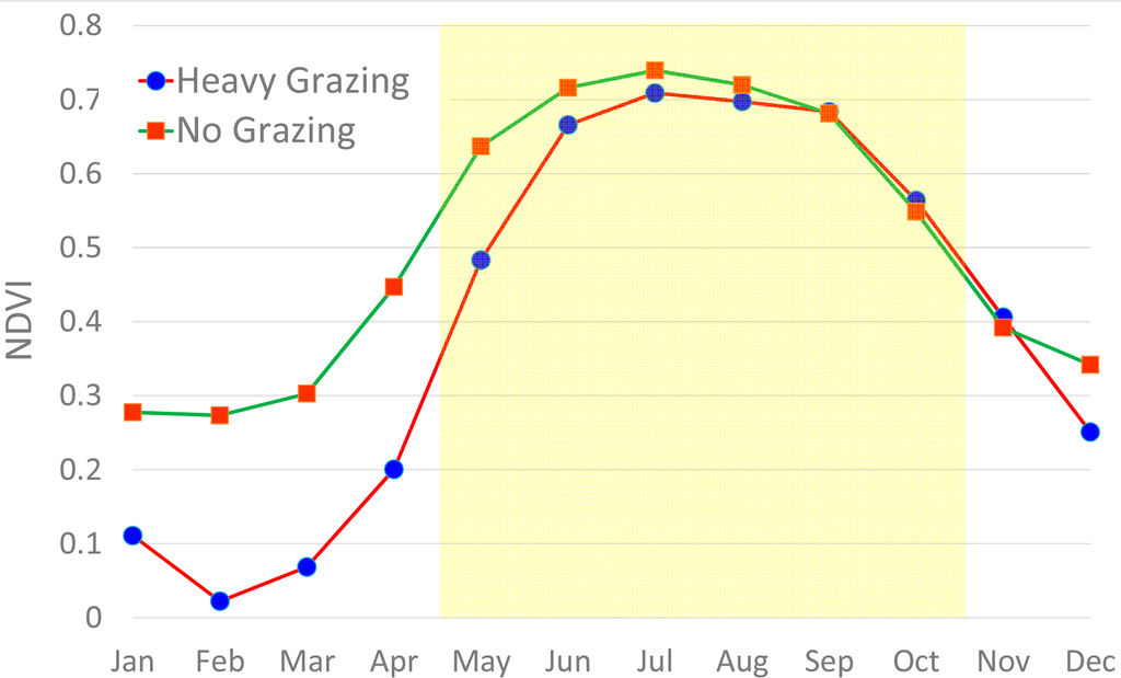 Figure 6 shows monthly NDVI (10-year average) in the heavy-grazing and no-grazing areas. During the period indicated by yellow in the graph (May to October), the land surface is rarely covered by snow and NDVI is expected to function as indicator of vegetation amount. NDVI was higher in the no-grazing area than in heavy-grazing area. Within the yellow-indicated period, the difference of NDVI between the two areas was largest (about 0.15) in May and smallest (near zero) in September to October. The difference of NDVI was most likely caused by the impact of snow. Grass begins to grow late in the heavy-grazing area of the park, probably because of late snowmelt in the area. This phenomenon agrees with the description of Shiping et al. [21] for alpine vegetation. The NDVI difference shown in Figure 6 is difficult to explain by the difference in grazing intensity. If the NDVI difference were due to the difference in grazing intensity, the NDVI difference would either be constant over the seasons, or the largest difference in NDVI would be observed during Summer, when the grazing in the park is expected to be most active, rather than in Spring.