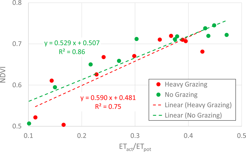 Figure 7 shows the relationship between NDVI and ETact/ETpot. This graph indicates that the amount of grass is closely related to soil water content in both the heavy-grazing and no-grazing areas, with high R-square (R2) values (0.75 and 0.86, respectively) of the linear regression lines. The highest NDVI and ETact/ETpot occur during summer. Summer rainfall in the park might have supported growth of pasture in both the heavy-grazing and no-grazing areas.