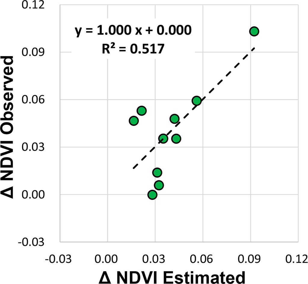 An estimated ΔNDVI using Equation (2) was plotted against the satellite-observed ΔNDVI (Figure 8). The model expressed in Equation (2) tended to represent observed ΔNDVI for the years when both the observed and estimated ΔNDVI were large.
