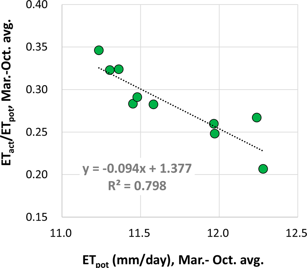 In Equation (2), the coefficient for ΔSnow has a negative sign, meaning that a relatively longer snow cover in the heavy-grazing area derives less vegetation in the area. This seems to be a theoretical result because pastures have difficulty growing before the snow melts, and it agrees with the discussion made for Figure 6. The coefficient for ΔETpot also has a negative sign, meaning that a relatively lower ETpot in the heavy-grazing area (low ETpot indicates lower radiation or colder temperature) derives more vegetation in the area. This result is incongruent with the common theory that vegetation prefers higher radiation and temperature. An interpretation of the result might be that lower radiation and colder temperature were the result of higher rainfall, and more rainfall derived more vegetation. Figure 9 shows the relationship between the March-to-October averages of ETpot and ETact/ETpot in the heavy-grazing area for the 10 years from 2001 to 2010. The figure clearly indicates that a year having high ETpot (i.e., better radiation and/or temperature conditions) has low ETact/ETpot (i.e., lower soil moisture condition). This is probably the reason that the coefficient for ΔETpot had a negative sign in Equation (2). In this research, soil water content was intended to be represented by ETact/ETpot, rather than ETpot. It was successful at the 16-day timescale (shown in Figure 7), but it was not successful at the annual timescale because soil water contents in winter did not contribute to vegetation growth in summer. At the annual timescale, ETpot apparently acted as an indicator of soil water content, contributing to the growth of grass.
