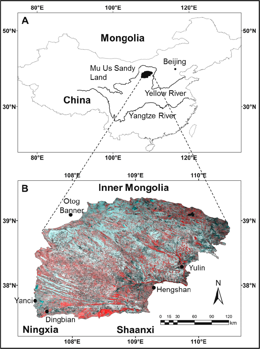 The Mu Us Sandy Land is one of the most seriously sandified areas in China [3]. It is located in the Ordos Plateau, between l07°20′E and 111°30′E and 37°27′N and 39°22′N, with an area of 38,372 km2 (Figure 1). Administratively, the Mu Us Sandy Land lies on the border area of the Inner Mongolia Autonomous Region, Shaanxi Province and the Ningxia Hui Autonomous Region.