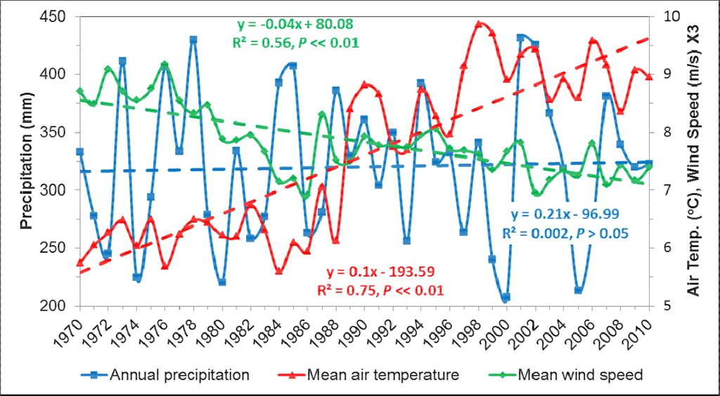 Meteorological data for 41 years (1970–2010) were acquired for 5 stations within and in the vicinity of the study area, namely Yulin, Hengshan, Dingbian, Yanchi, and Otog Banner (Figure 1) from the China Meteorological Data Sharing Service System ( http://cdc.cma.gov.cn/). The variables include monthly precipitation, air temperature and wind speed. The annual time series of these three variables is presented in Figure 2, and the departure of precipitation from the normal is illustrated in Figure 3.