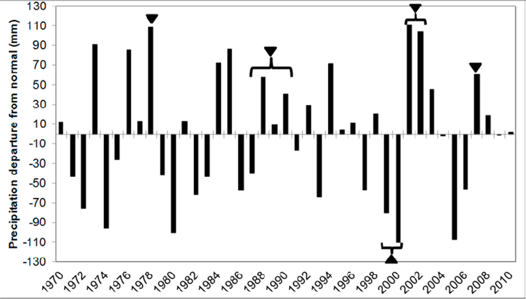 Landsat images were selected according to the following criteria: (1) images from the peak of the growing season (either August or September), preferably of the same year; (2) images from years with above-average precipitation; and (3) cloudless images. Due to these strict initial conditions and the fact that the area of interest should be mosaiced by four Landsat images, the number of available images in the archives ( http://glovis.usgs.gov/; http://edcsns17.cr.usgs.gov/NewEarthExplorer/; and ftp://ftp.glcf.umiacs.umd.edu/glcf/Landsat/) was found to be very limited. Consequently, four sets of images, several years apart, were chosen between 1978 and 2007 to fulfill the above-mentioned requirements (Figure 3, Table 1). Although all the used images were confined to less than two months in the summer, seasonal variability of the rainfall might also has potential impact on the inconsistency of the data. Bearing this in mind, the raw precipitation dataset was analyzed. No notable change in the seasonal patterns throughout the entire study period was found. A unimodal shape with a significant high peak of rainfall amount is evident in July and August. We conclude, therefore, that during a window of 7 weeks (from 31 July to 23 September), the spectral signal is less affected by seasonal variations and, thus, comparable. In addition to the rainy years, one set of images was used for the same season, but for a drought year (Figure 3, Table 1). Ideally, as in the two edge sets (i.e., 1978 and 2007), all the images were acquired in August of the same year. Both years are characterized by high above-average precipitation. The second set is composed of images from four consecutive years (1988–1991) and denoted hereafter as 1988 for simplicity. The third set is composed of two consecutive years (1999 and 2000) and denoted hereafter as 1999. Lastly, the fourth set is composed of two consecutive years (2001 and 2002) and denoted hereafter as 2001.