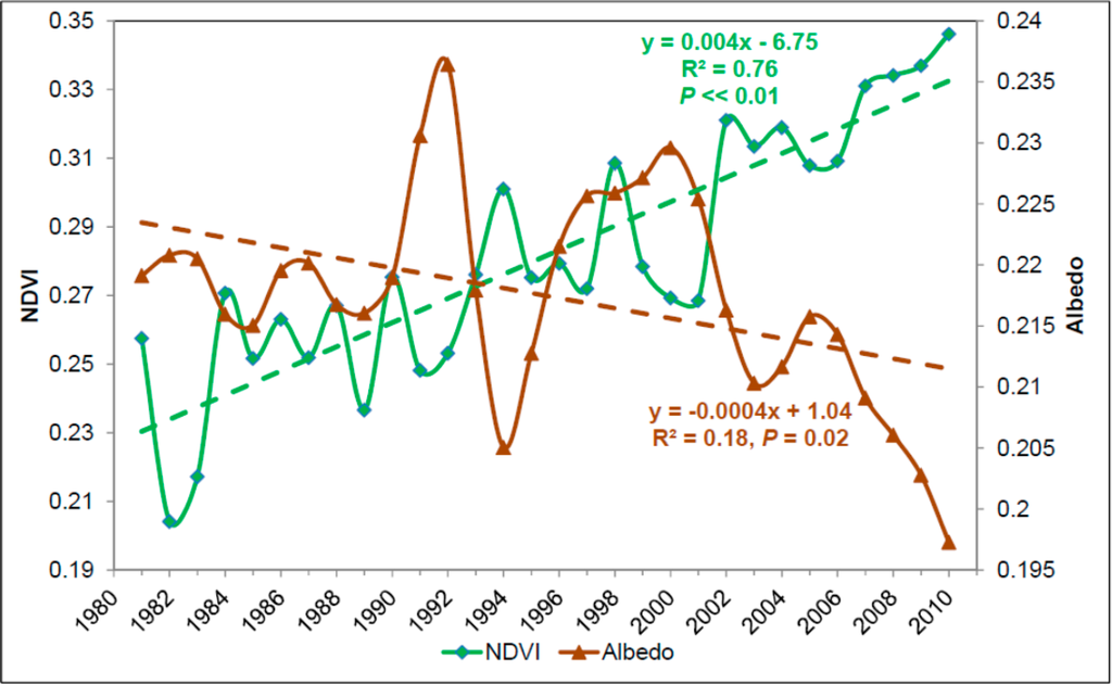 NDVI and albedo, although comparable to tasseled cap’s brightness and greenness indices, have the advantage of being computed using reflectance values extracted from various Landsat platforms since the early 1970s.