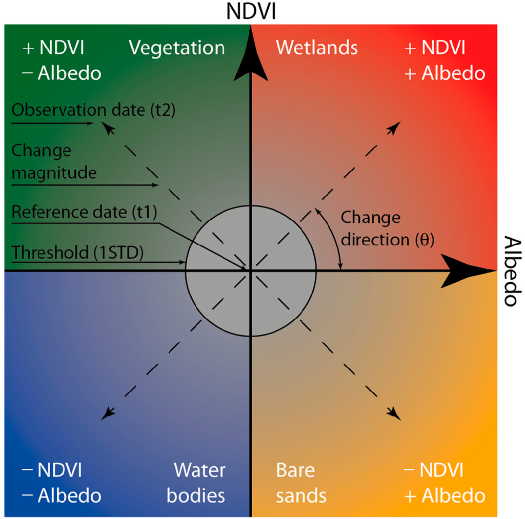 In order to explore these different trends and to consider the knowledge gaps, an appropriate remote sensing based change detection technique has to be employed, taking into account vegetation recovery on one hand, and sandification on the other. In this regard, Change Vector Analysis (CVA) seems to be the most suitable one, since it is a multivariant change detection technique that accepts two or more spectral bands, spectral features or biophysical indicators (e.g., spectral indices, land surface temperature, etc.) associated with the pixel of an image [28,29]. CVA was originally proposed by Malila [28] and further developed by the pioneering studies of Lambin, Strahlers and Ehrlich [30–33]. In CVA, each pixel is represented by a point in a multidimensional space (spectral and temporal) [34]. The methodology (detailed in the Datasets and Methodology section) enables high resolution pixel-by-pixel mapping of the direction and the magnitude of the changes. CVA has several notable advantages over other change detection techniques. Due to its two output products, change magnitude and direction, the CVA technique enables the user to stratify different types of change with respect to land use or land cover dynamics in a specific region. CVA also has the capability to concurrently analyze change in all data layers as opposed to selected bands [34]. Note that most of the studies using this technique have been carried out in forested regions (e.g., [28,35–37]), where the ground features are relatively easily defined (e.g., biomass loss, forest clearing, biomass gain, burnt area, etc.). Far fewer works (e.g., [38–41]) have applied this technique to drylands. In deserts, the biophysical variables and their resulting directional interpretation are different, as will be described later.