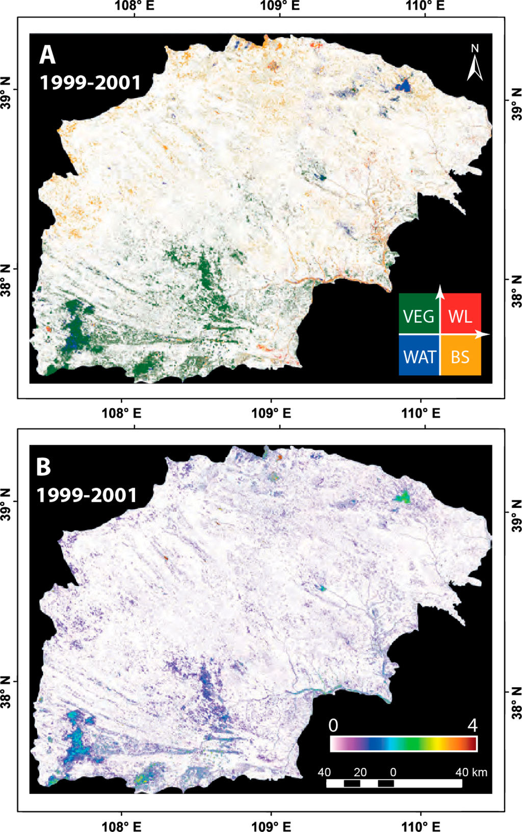 Based on NDVI and albedo, CVA was applied to: (1) a pair of sequential drought and rainy years (1999 and 2001) as observed in the Landsat images; (2) three pairs of consecutive time periods during the rainy years (i.e., 1978–1988, 1988–2001 and 2001–2007) as observed in the Landsat images; and (3) the entire study period (1978–2007) of the Landsat time series.