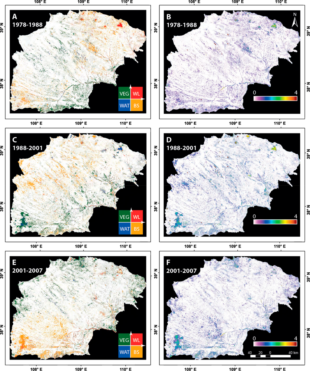 Figure 7 illustrates the direction and magnitude results for each of the pairs of consecutive time periods of the rainy years. It can be seen that in the early 1980s, agricultural activities were initiated in the southern part of the study area and along rivers (Figure 7A,B). A small water body, called Hongjiannao Lake, in the north-east of the study area, dried out during this period and exhibits the most pronounced change. In the late 1980s and during the 1990s, sandification was recognized in the center and northern part of the area, while growth of vegetation occurred in the south and especially in the southwest (Figure 7C,D). Magnitude of change ranges from low in the bare sands areas, moderate over the vegetation re-growth areas, and high in the water bodies that were flooded again during this period. Note that the magnitude of the change and the extent of the vegetation patches are less than those observed between 1999 and 2001 due to the post-drought recovery (Figure 6). It can be concluded, therefore, that this change was mainly due to agricultural activity rather than a reaction to rainfall. Between 2001 and 2007, new vegetation was observed in the eastern, northern, and western sections of the area, while more sands appeared in the south in area that was covered before by natural vegetation. In this area, small interdune water bodies dried out and turned to be wetlands. Also, several dams were built along the rivers, storing water for irrigation (Figure 7E,F).