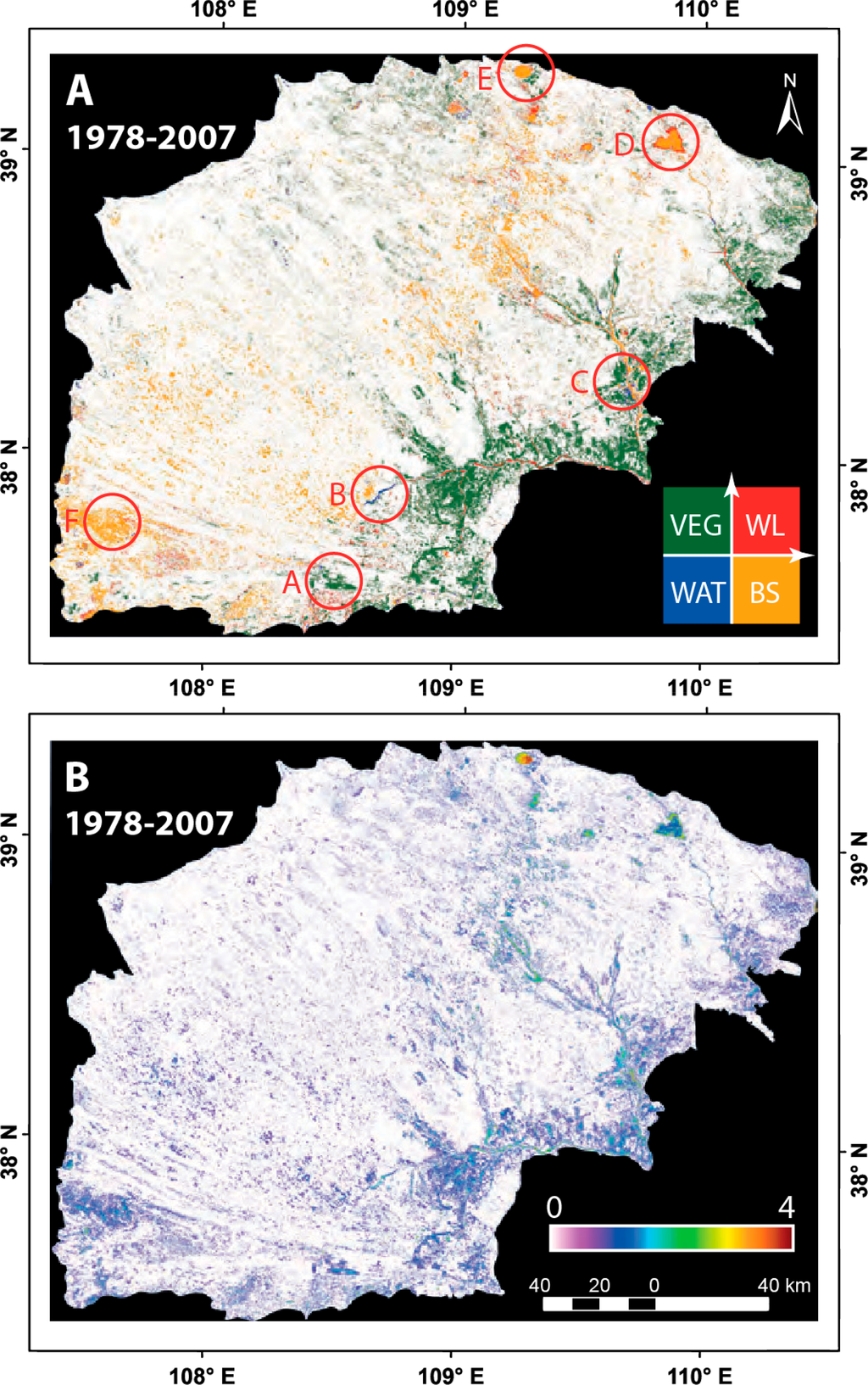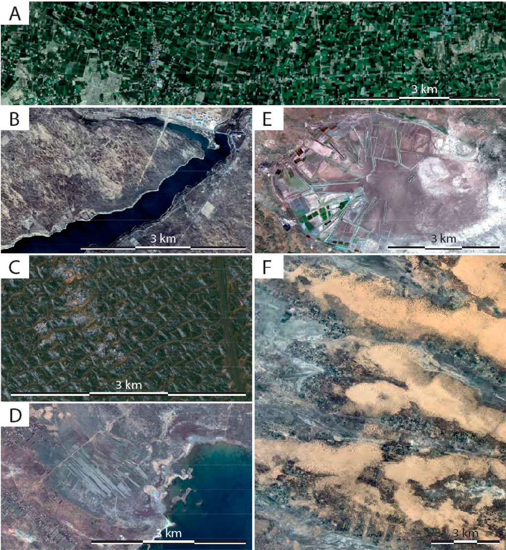 Figure 8 shows the CVA products for the entire study period (1978–2007). In general, it can be seen that vegetation growth and dune stabilization is evident in the eastern Mu Us Sandy Land, while bare sands have expanded to the central-northern and the southwestern parts. These results are consistent with those published in other studies (e.g., [21,26]). Several hot-spot change sites were used for visual interpretation of the results and to confirm the validity of the processes resulted by the CVA variables. This was implemented by zooming-in with very high spatial resolution images acquired by Ikonos, QuickBird or WorldView that are available online on the Google Earth website (Figure 9). Figure 9A (corresponds to Point A in Figure 8A) shows intensive rain-fed agricultural fields in the lowlands. The main crops in the Mu Us Sandy Land are maize and potatoes, sown in May and harvested in October. Figure 9B (corresponds to Point B in Figure 8A) exhibits the Batuwan Reservoir on the Wunding River. It is one of a series of water reservoirs in the region that were built to generate electricity and to supply water for irrigation and industrial purposes [58]. Figure 9C (corresponds to Point C in Figure 8A) demonstrates afforestation activities to stabilize small transverse to barchanoid ridge dunes. Trees, such as Pinus sylvestris var. mongolica, have been planted since the 1980s near the city of Yulin, and bushes, mainly Hedysarum scoparium and H. leave, were seeded from the air [3,8]. Figure 9D (corresponds to Point D in Figure 8A) shows wetlands to the north of Hongjiannao, China’s largest desert lake, which has shrunk by about 10 km2 between 1989 and 2007, and its water level is declining by 20 cm annually. The lake is fed by a high level of groundwater and a small river flowing from the north. It is predicted that the lake may vanish in a few decades, due to climate change and human activities, since water has been transported to irrigate the nearby croplands [59,60]. Wetlands are located in the northern part of the lake, near the river inlet, where high albedo values are created by exposed salt and alkali layers, while high NDVI values are caused by vegetation [61]. Figure 9E (corresponds to Point E in Figure 8A) shows Kangjia Bala’er, one of the former water lakes that, since drying up, has become an alkali quarry. Figure 9F (corresponds to Point F in Figure 8A) presents shifting longitudinal dunes that were caused by combined anthropogenic reasons (e.g., grazing pressure) and strong westerly winds that characterize the western part of the Mu Us Sandy Land [21]. These dunes expand into arable lands and urban areas.