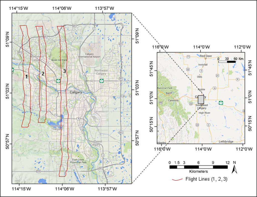 Our study area consists of three non-adjacent H-Res TIR flight-lines (Figure 1) that were extracted for analysis from a full City of Calgary TABI-1800 (Thermal Airborne Broadband Imager) dataset (∼825 km2) composed of 43 flight-lines (∼600 GB). These three flight-lines were acquired during the night (between 00:00 and 04:30) on 13 May 2012 and cover a heterogeneous urban area of ∼182 km2 at a 50 cm spatial resolution. During their acquisition, the ambient night-time temperature ranged from 8 to 13 °C and winds ranged from 5 to 13 km/hr., gusting to 20 km. Local weather data were accessed from 26 reporting sites available from the Weather Underground ( http://www.wunderground.com - last accessed 6 June 2014).