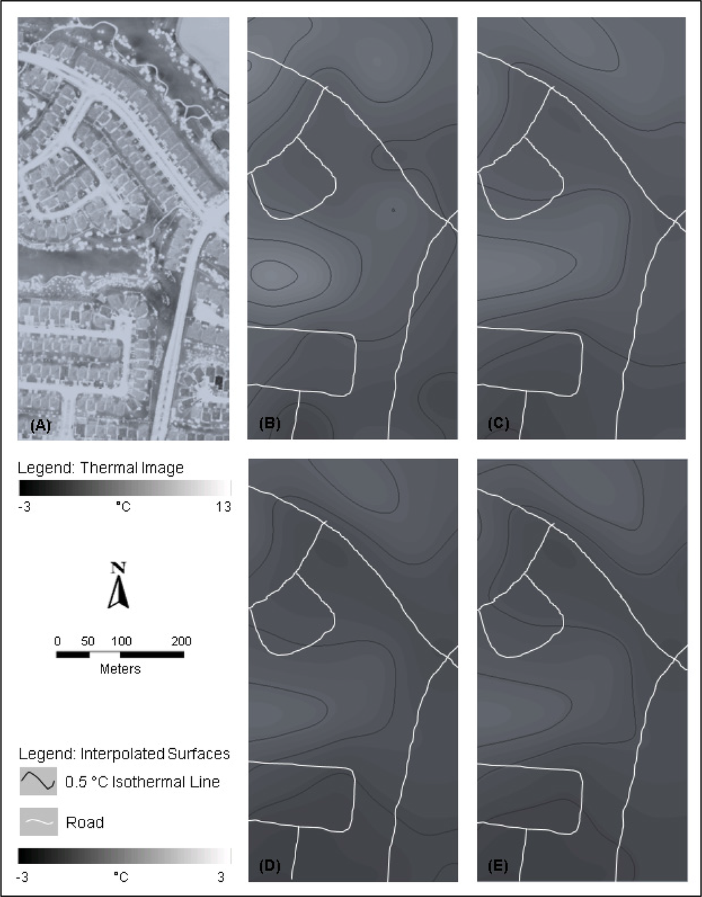 We note that prior to selecting IDW, seven different interpolation techniques were visually and statistically evaluated [34]. These included: (i) Splines [35], (ii) Nearest Neighborhood [36], (iii) Polynomial [37], (iv) Kriging [38], (v) Inverse Distance Weighted (IDW), (vi) Triangular Integrated Network (TIN) [39], and (vii) Radial Basis Function (RBF) [40]. Based on our visual and statistical assessment of the resulting surfaces, IDW produced the smoothest appearing surface based on locally varying values; which is consistent with the conceptual models of locally explicit, but regionally continuous microclimatic variability [29,30]. Therefore, we have used IDW interpolation for the remainder of this analysis.