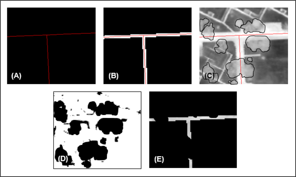 To extract the Road class, we first apply a 3 × 3 median filter to the TIR image to reduce noise and simplify the scene. We then create a 1.5 m buffer on each side of the GIS Road center (Figure 3A) to produce a 3.0 m wide Road mask (Figure 3B). A 3.0 m section along the road center was chosen based on (i) a minimum Calgary road width (∼10 m) and (ii) the ability to avoid sampling vehicles parked along the sides of the road (∼2.5–3.5 m). The Road mask is then combined with the TIR image to extract the central portions of the corresponding roads. A visual inspection reveals that portions of many roads are covered by trees (Figure 3C). To eliminate these, a vegetation mask (Figure 3D) is created by calculating an NDVI (from the 1.0 m RGB-NIR ortho-photo), then quickly manually thresholding it based on visual inspection. Once defined, this vegetation mask is then dilated by 1.0 m to compensate for possible geometric error between the RGB-NIR and the TIR image. This dilated vegetation mask is then applied to the 3.0 m Road class to eliminate overhanging vegetation (Figure 3E).
