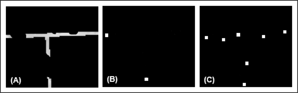 Airborne data are seldom acquired in perfect straight lines. Consequently, the border of such data are often padded with zero values to ensure a rectangular shape of the output flight-line (Figure 6A). To tie the interpolated TURN-surface to this edge, its boundary is detected using a Laplacian edge detection filter (Figure 6B) and sample points are taken along its border at 10 m intervals (Figure 6C). In this section we describe sample optimization at 10 m intervals. Later, the same process is repeated for 20, 50, and 100 m intervals and the results are described in Section 4. For parsimony, the border samples are then assigned the values of the closest Road sample (Figure 6D) and are combined with the samples generated in step 3.3 (Figure 6E). Next, a cleaning filter is applied over all flight-line samples so that a maximum of one sample point exists within a 10*10 m window (Figure 6F). Cleaning is performed to avoid oversampling of points. The remaining sample points are then interpolated to create a (continuous) Road temperature variability surface (a TURN-surface) over the entire flight-line.