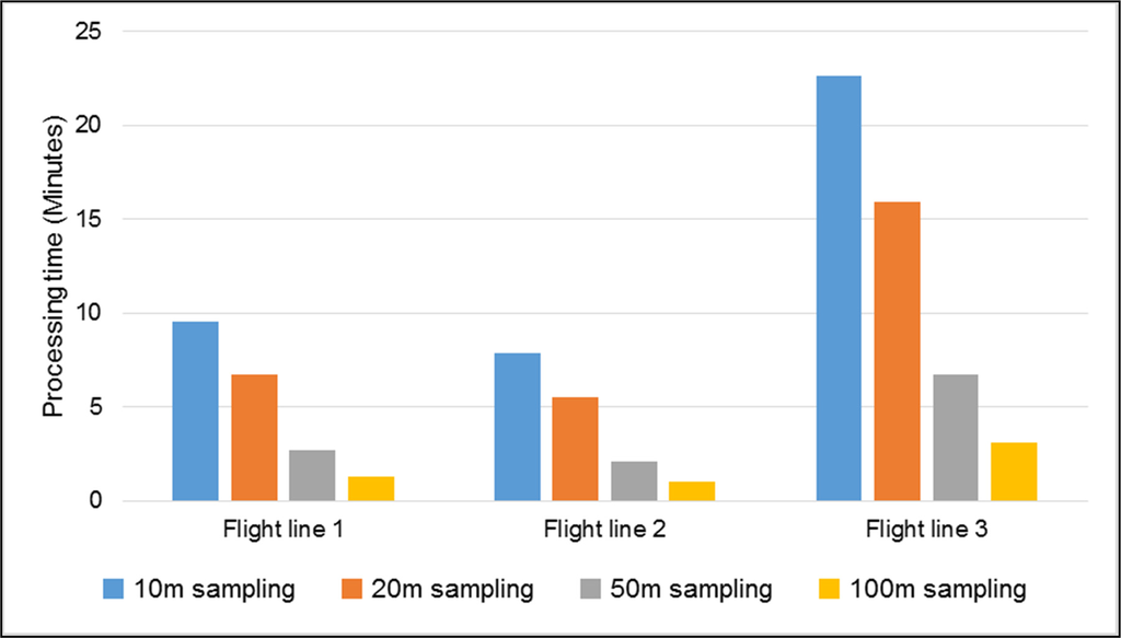 If we consider the results shown in Figure 7 and were to extrapolate them to process the entire City of Calgary TIR scene (which consists of 43 TABI-1800 flight-lines covering ∼825 km2 and a data volume of ∼600GB), we estimate that it will require ∼7 hours to process all flight-lines at the 10 m sampling interval, ∼5 hours for the 20 m sampling interval, ∼2.5 hours for the 50 m sampling interval, and ∼1.2 hours for the 100 m sampling interval. Thus, the processing time is negatively correlated with the sampling interval (i.e., the larger the sampling interval, the less processing time involved). We also note that flight-line 3 requires considerably more processing time than the other flight-lines, as it is ∼50% larger (in size) than the other two flight-lines that were evaluated (see Table 1 and Figure 1).