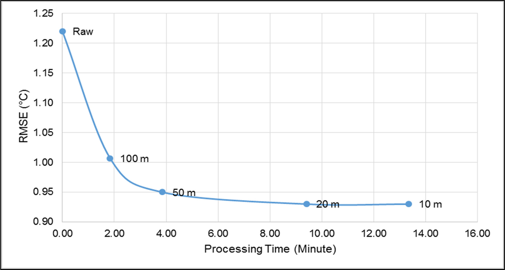 Results show that as the sampling interval decreases, the accuracy increases (thus the RMSE gets smaller), but the processing time also increases. However, we note that between the 10 m and 20 m sample intervals, processing time decreased by ∼30%, but statistically, the average accuracy did not change noticeably. Conversely, the processing time for the 100 m sample interval is 85% less than at the 10 m sampling interval. However, its average accuracy is considerably decreased (∼7%). Considering these results, we conclude that 20 m is the optimum sample interval for this study, as it balances local temperature variability (Figure 10) and computation speed.