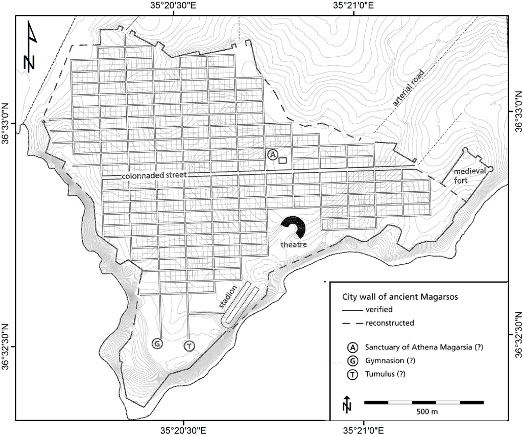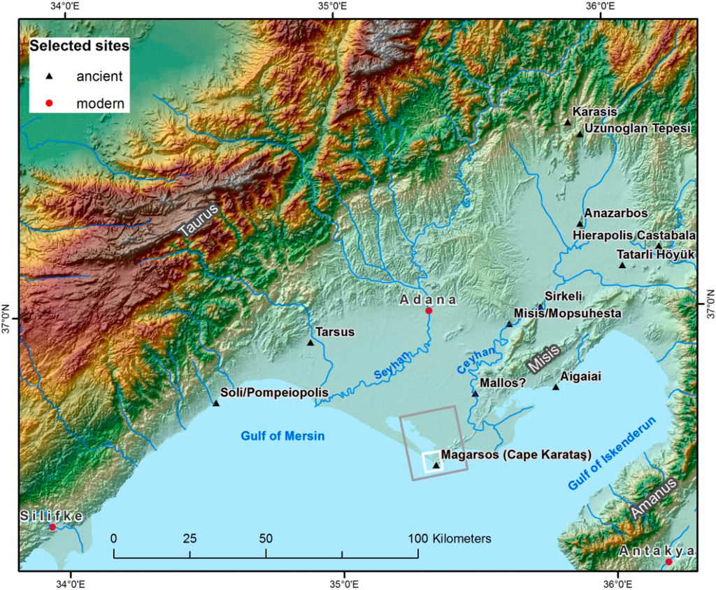 - Rosenbauer, R.; Sayar, M.H. Die Siedlungsmauer am Kap Karatas. Ein Indiz für die Stadtneugründung von Antiochia am Pyramos an der Stelle von Magarsos? In Hellenismus in der Kilikia Pedias; Hoffmann, A., Ed.; Ege Yayınları: İstanbul, Turkey, 2011; Volume 14, pp. 155–174. [Google Scholar]