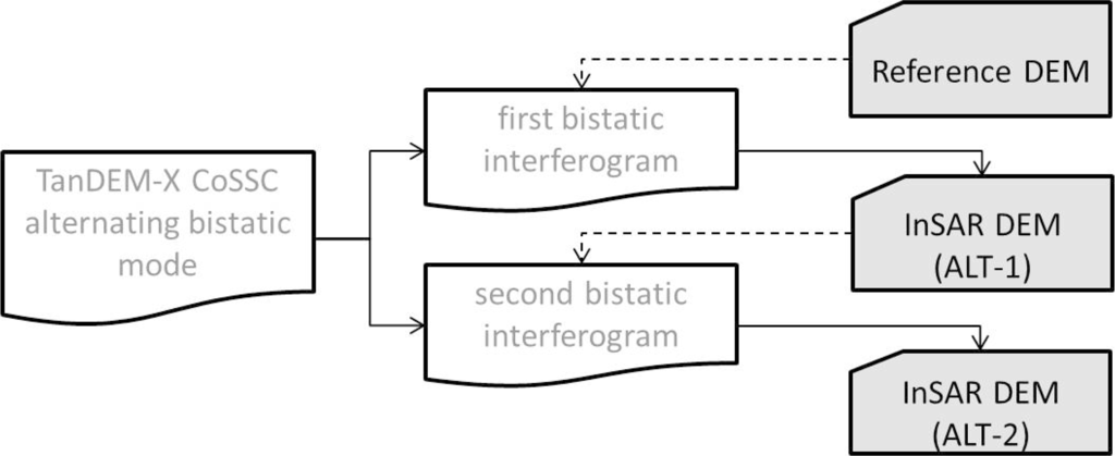 TanDEM-X raw data were processed by the TanDEM-X ground segment of DLR following an operational processing chain. The most important functionality of this pre-processing is the bistatic SAR focusing of the image pairs to Co-registered Single Look Slant Range Complex (CoSSC) products. Further processing included the phase unwrapping, multi-looking, re-flattening, phase-to-height conversion and geocoding of the slant range data. An explanation of the theory of SAR processing is beyond the scope of this paper. A detailed review of SAR interferometry is given by [26]. Here, our particular emphasis was on the appropriate selection of the reference DEM for the interferogram flattening which has considerable impact on phase unwrapping and hence on the quality of the final DEM product. Another focus of the processing was on the evaluation of the alternating bistatic mode. We customized a workflow that was proposed by [30] in order to maximize the phase stability and phase-to-height sensitivity for DEM processing. In a first step, a combination of one monostatic and one bistatic image from TDX and TSX was used in order to generate an across-track interferogram and a preliminary DEM product (ALT-1). This product was then used as reference for the interferogram generation of the opposite monostatic/bistatic image pair (ALT-2, see Figure 2). The interferometric processing of the two independent monostatic images was not fully supported by the software package (ENVI/SarScape 4.4) at the time of finalizing this manuscript and could not be evaluated.