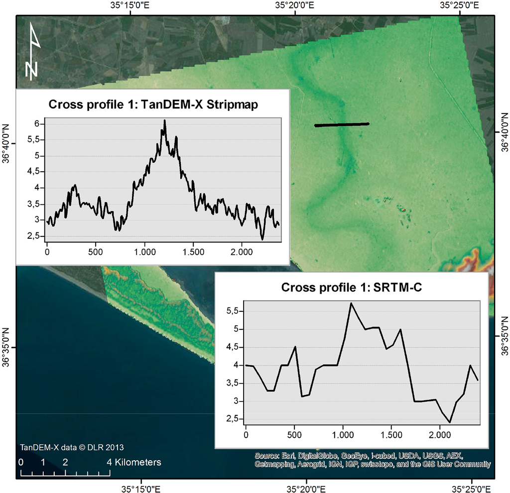 The TanDEM-X Stripmap DEM complements the color composite in terms of a general overview of the surface topography. It depicts clearly the Misis mountain range and even the minor height variability within the shrubland formation at the western coast of Cape Karataş as well as the decline from the shrubland to the hinterland and the lagoon are clearly evident. From the point of view of the archaeologist, the most remarkable phenomenon in the DEM image is the detection of a curvilinear structure that shows a very smooth rise in height in comparison to the surroundings (see darker green meandering feature from north to south in Figure 3). This structure can be associated to a palaeochannel of a former riverbed crossing the area from north to south and discharging into the Mediterannean Sea north of the ancient site of Magarsos after carving into the Misis mountains. This palaeochannel is assumed to form part of the ancient course of the river Seyhan. Compared to the present (see Figure 1) the river changed its course dramatically within late Holocene and now flows in the Mediterranean Sea approximately 40 km west of Cape Karataş. This is in accordance with findings from [39,40] who detected different periods of quaternary sedimentation related to sea level variations and regional tectonics in the Cilicia basin. The positive height anomalies in the former river course are explained by the nature of emergence of such riverbeds that form river side dams (natural levees) under subtropical conditions which can be observed for the present course of the river Seyhan. After separation the former river between the natural levees was filled with colluvial sediments and forms a slight elevation compared to the surrounding landscape. Comparable features were also detected from SRTM data by [41] in southern Iraq but the level of detail of the TanDEM-X Stripmap DEM allows for a more detailed analysis of the shape and depth of those objects (see Figure 4). Today, the riverbed and floodplain is fully sedimented and the fertile soils provide the ground for intensive agricultural production.