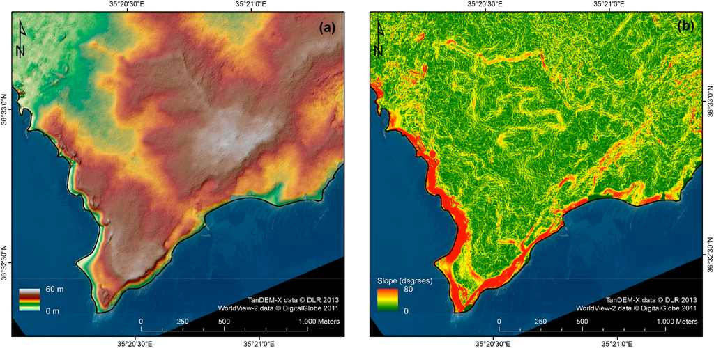 The final DEM from the TanDEM-X Stripmap product (bistatic 2) is visualized in Figure 3 together with a RGB color composite image from the same acquisition. The color composite is generated based on the coherence and backscatter information from the monostatic and bistatic channels (TDX/TSX) of the Stripmap product (Red = coherence; Green = mean Intensity; Blue = intensity difference between the monostatic and the bistatic radar backscatter). It illustrates the regular mosaic of the agricultural landscape in the hinterland as well as the dune and Macchia formations in the western coastal area. For reasons of visualization, the color ramps of the composite layers in the figure have been inverted, meaning that high values for coherence, intensity and difference are represented in low intensities for the respective color. As a consequence, Blue and Cyan areas in the composite image represent the zones of high intensity and high coherence, like, e.g., shallow water areas, agricultural fields and bare land. In opposite, Red areas symbolize area of low coherence and consequently high intensity difference, like vegetated areas and regions with steep slopes, e.g., the escarpments along the coast of Cape Karataş. In general, the coherence-intensity color composite provides a good base for the characterization of the landscape around the prehistoric site in the study area.